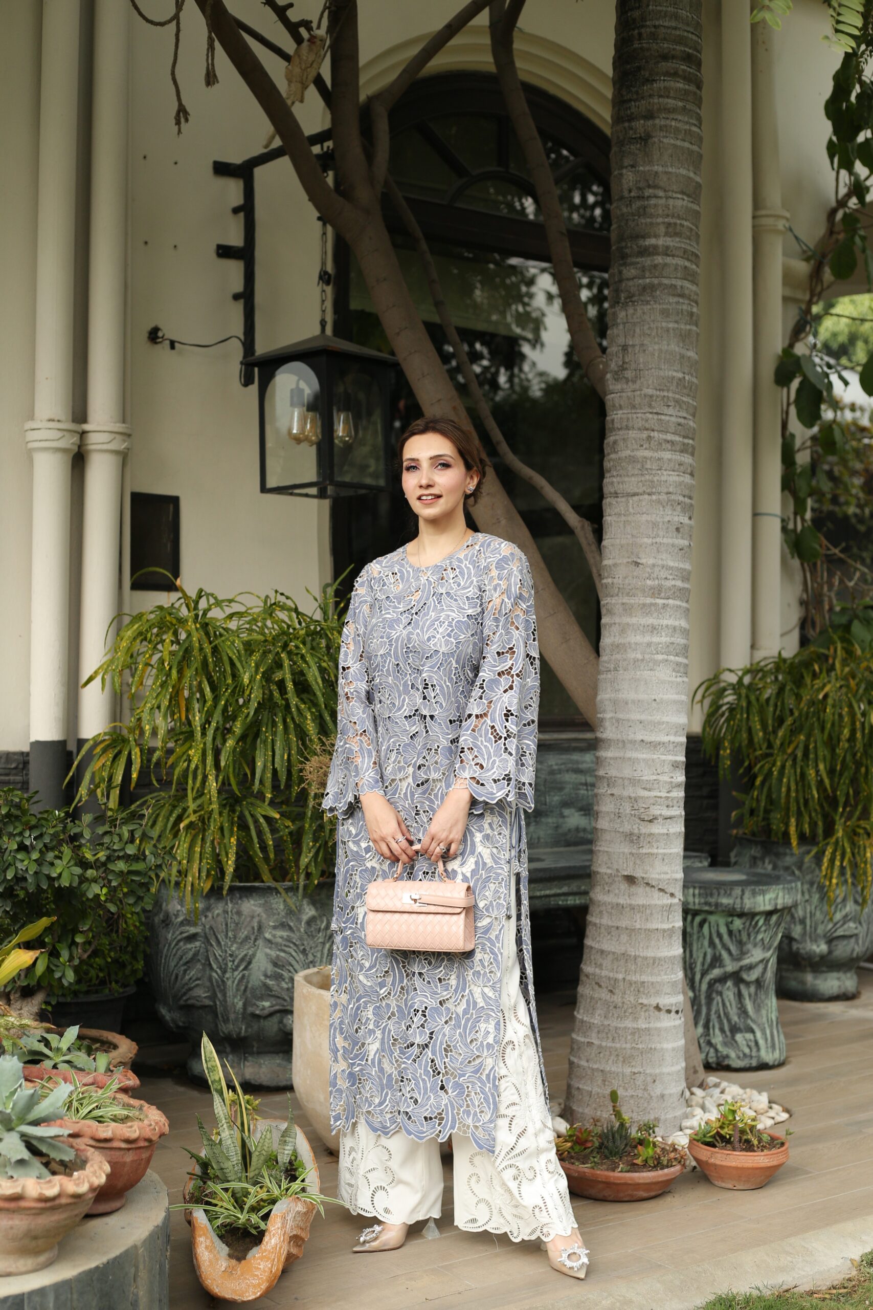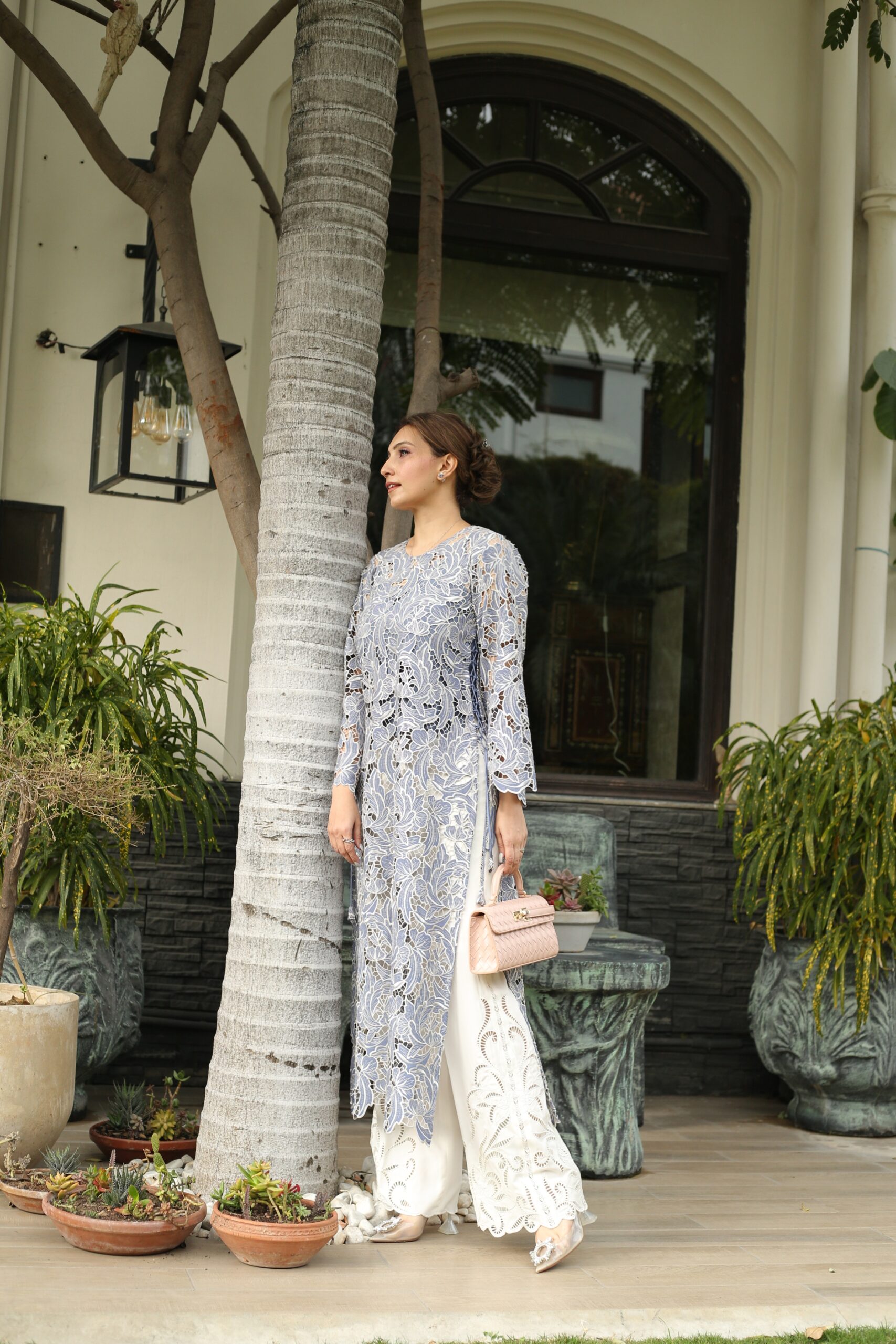 Silk cutwork long shirt beautifully stitched comes with high waist cutwork crepe pants .