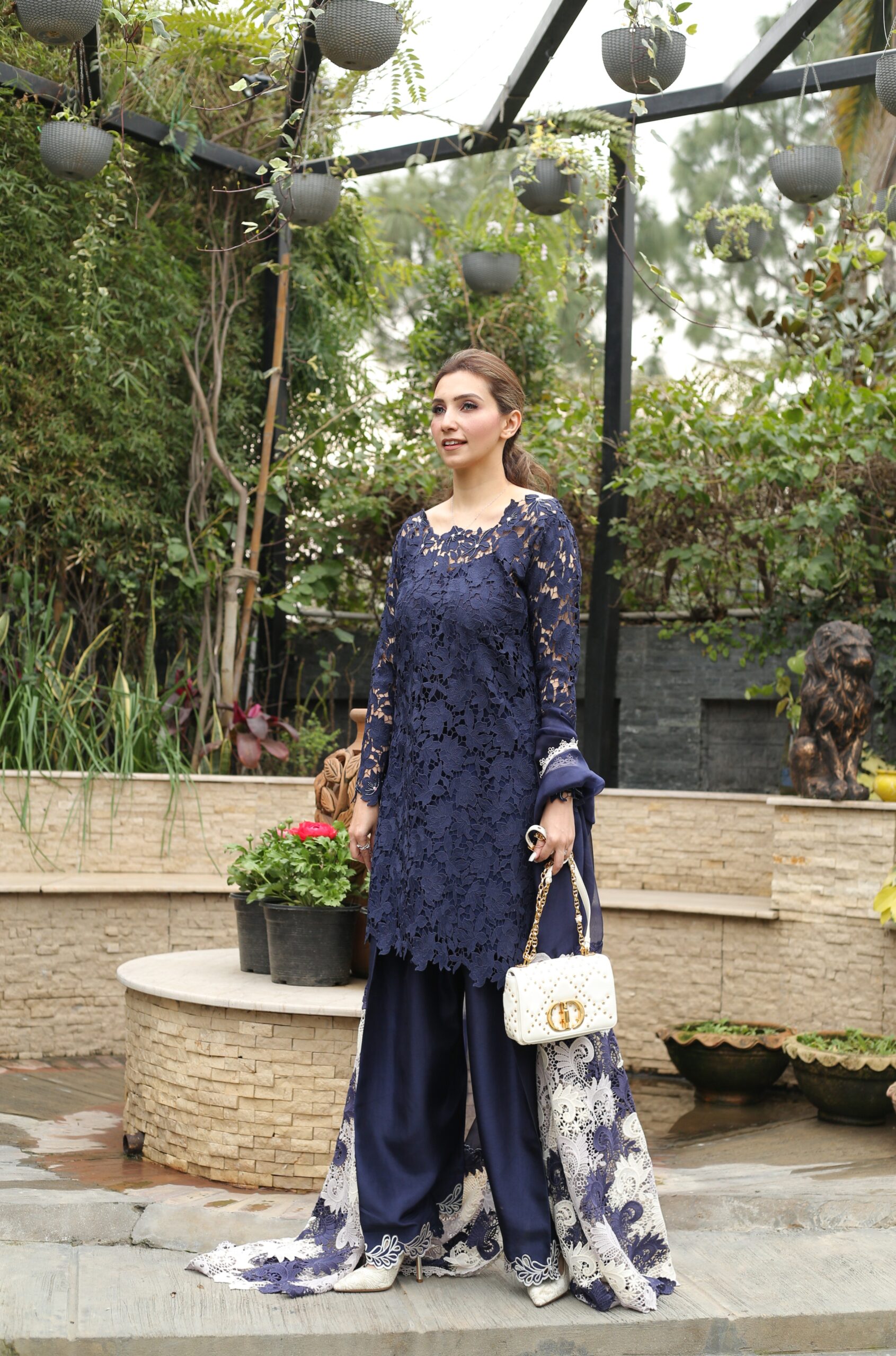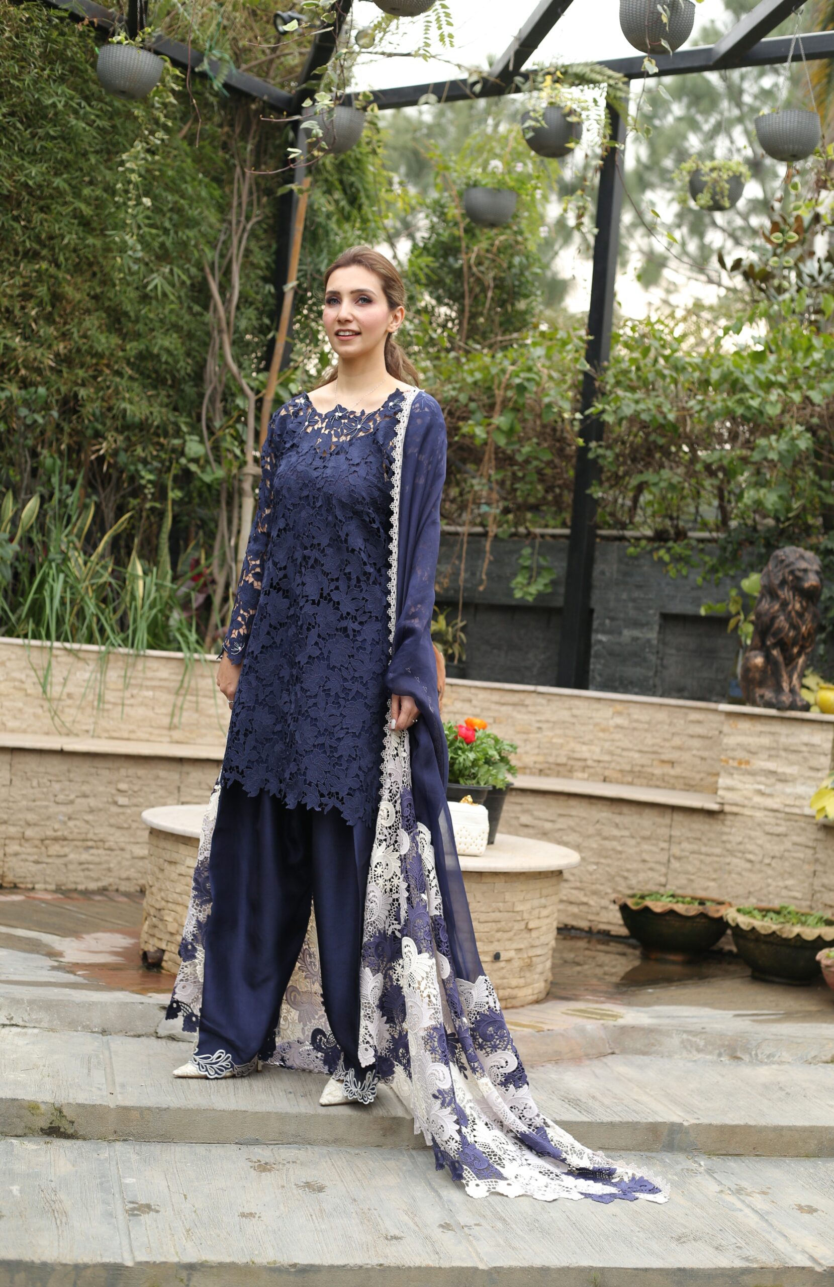 Cutwork shirt with beed work on neckline comes with embroidered farshi shalwar and organza cutwork dupatta