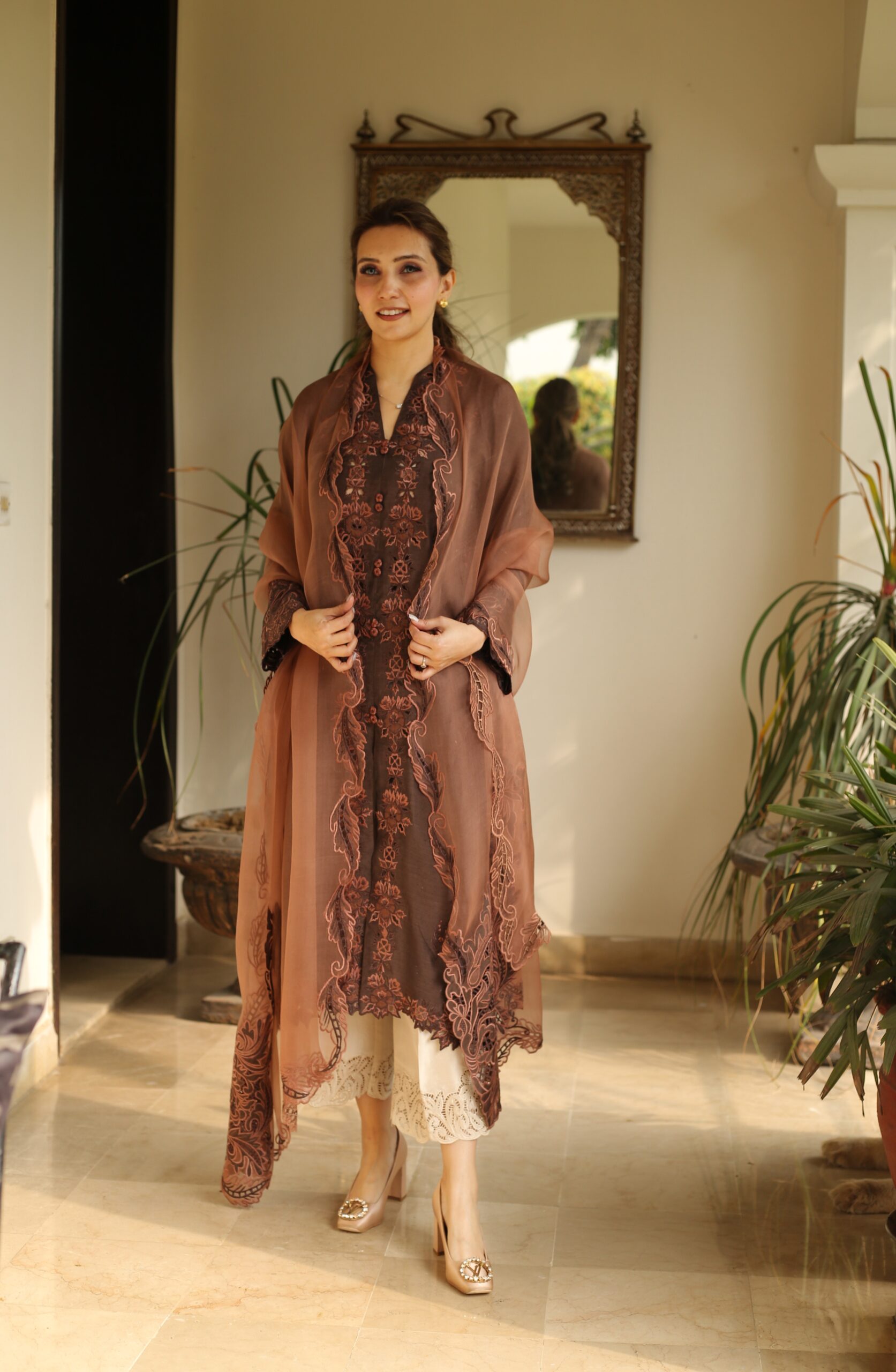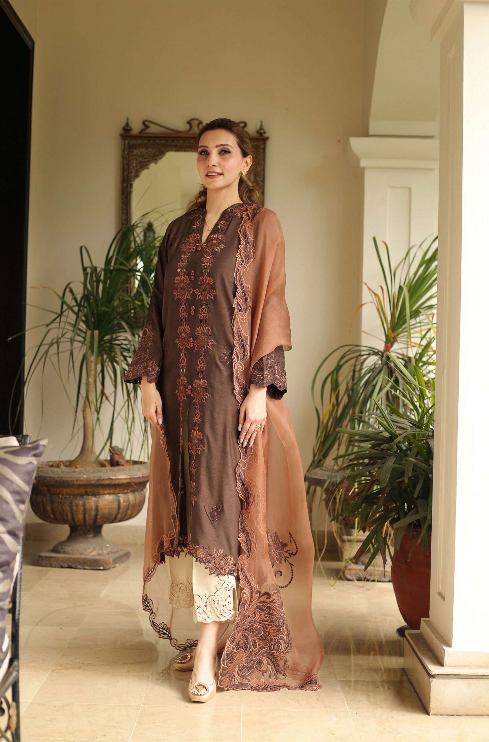 Rich brown ensemble adorned with intricate tea pink contrast embroidery , the elegant open shirt add effortless grace ,paired with a delicately embroidered tea pink cutwork dupatta . Beige cutwork pants can ordered seperately .