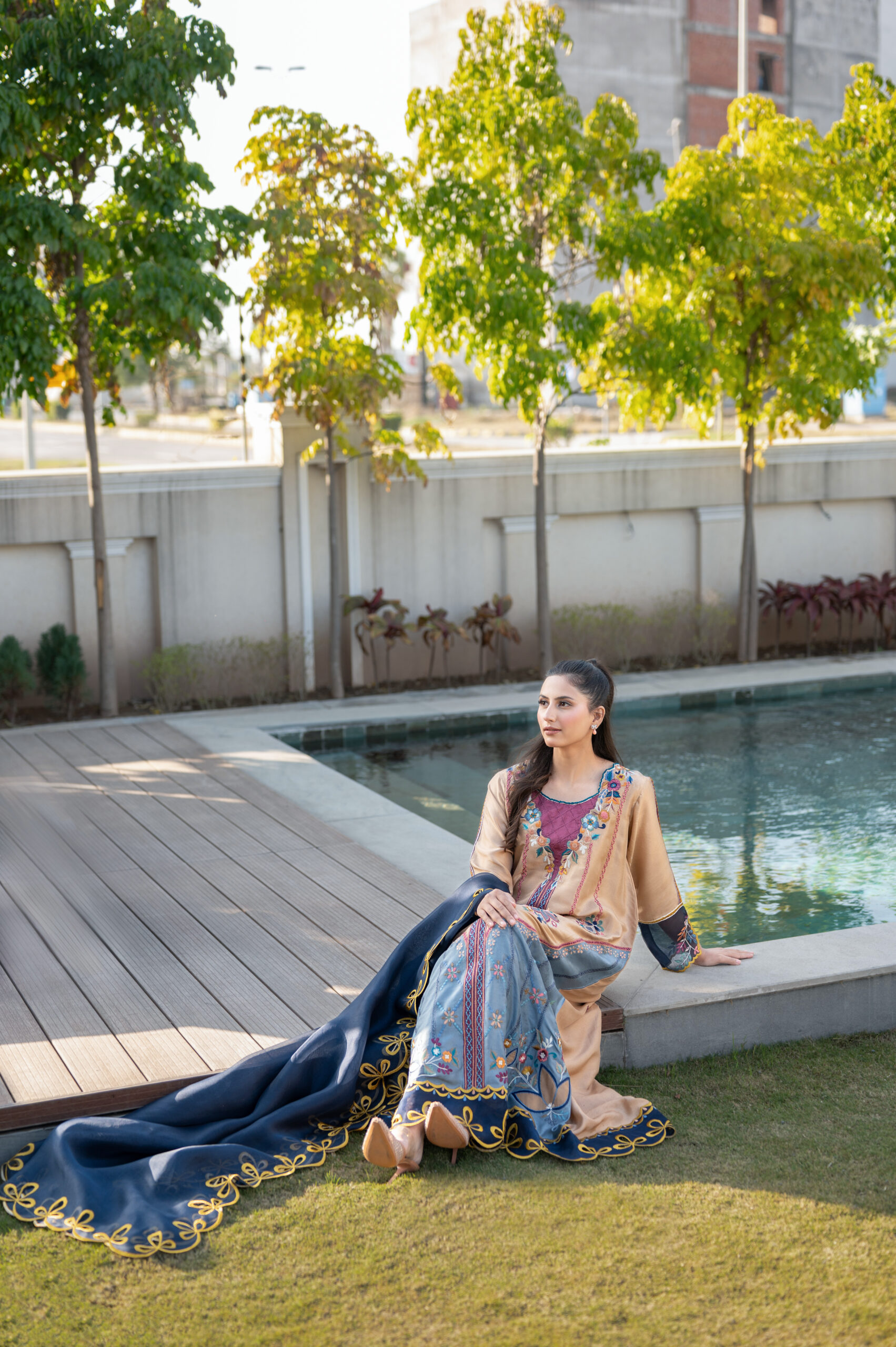 A rawsilk attire with detailed embroidery pattern full of gorgeous color and cutwork embroidery on different shades of fabric it comes with silk pants and organza cutwork dupatta .