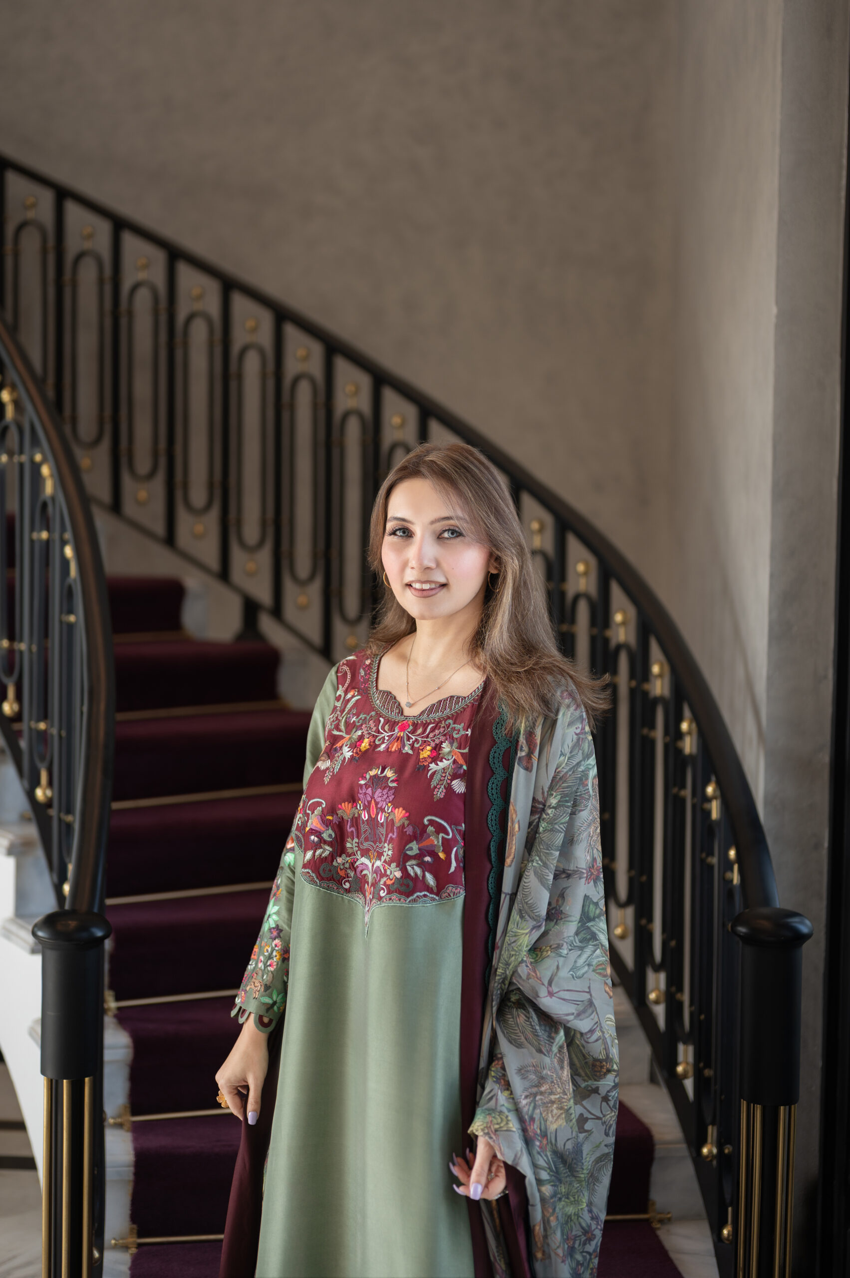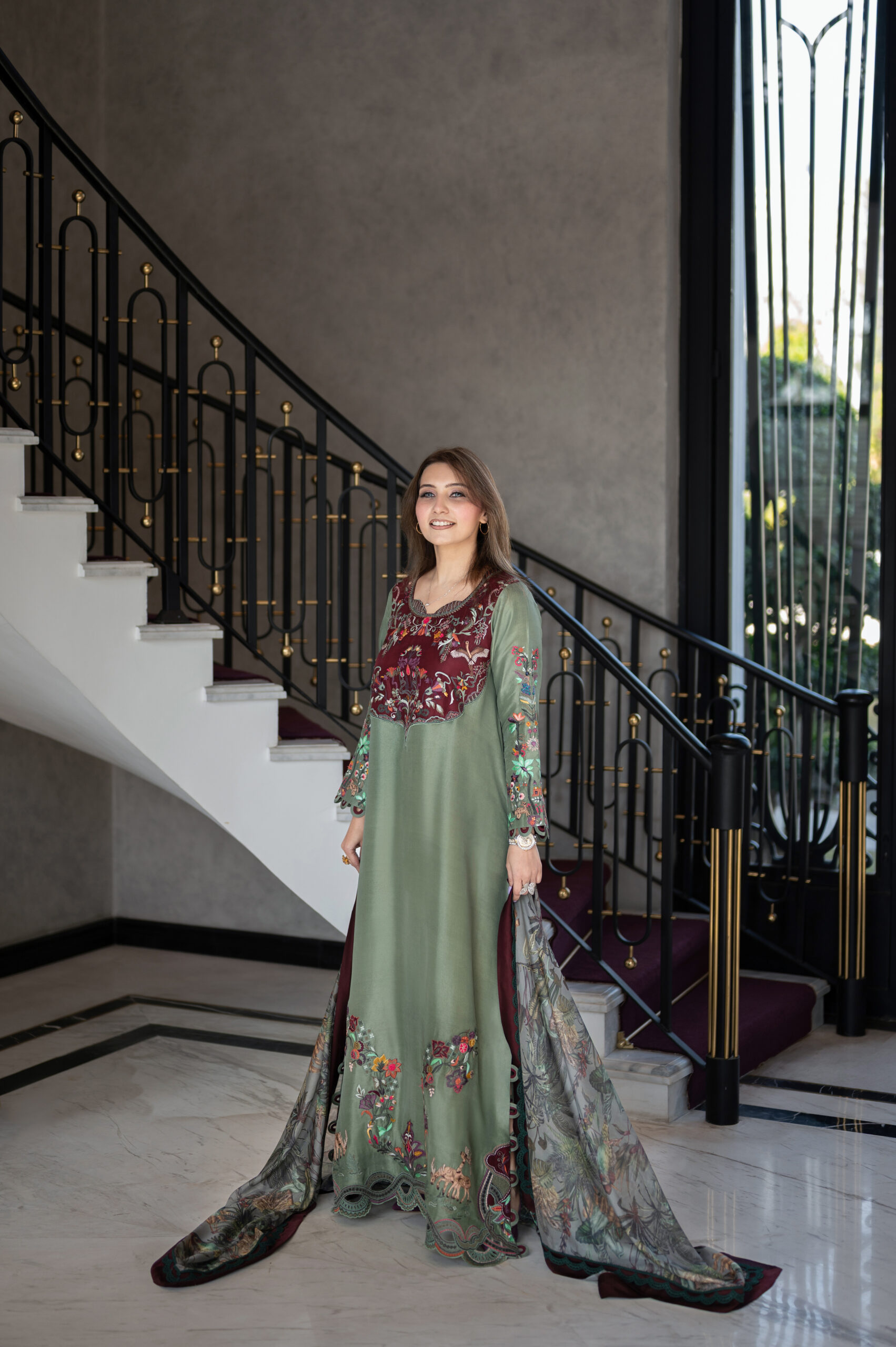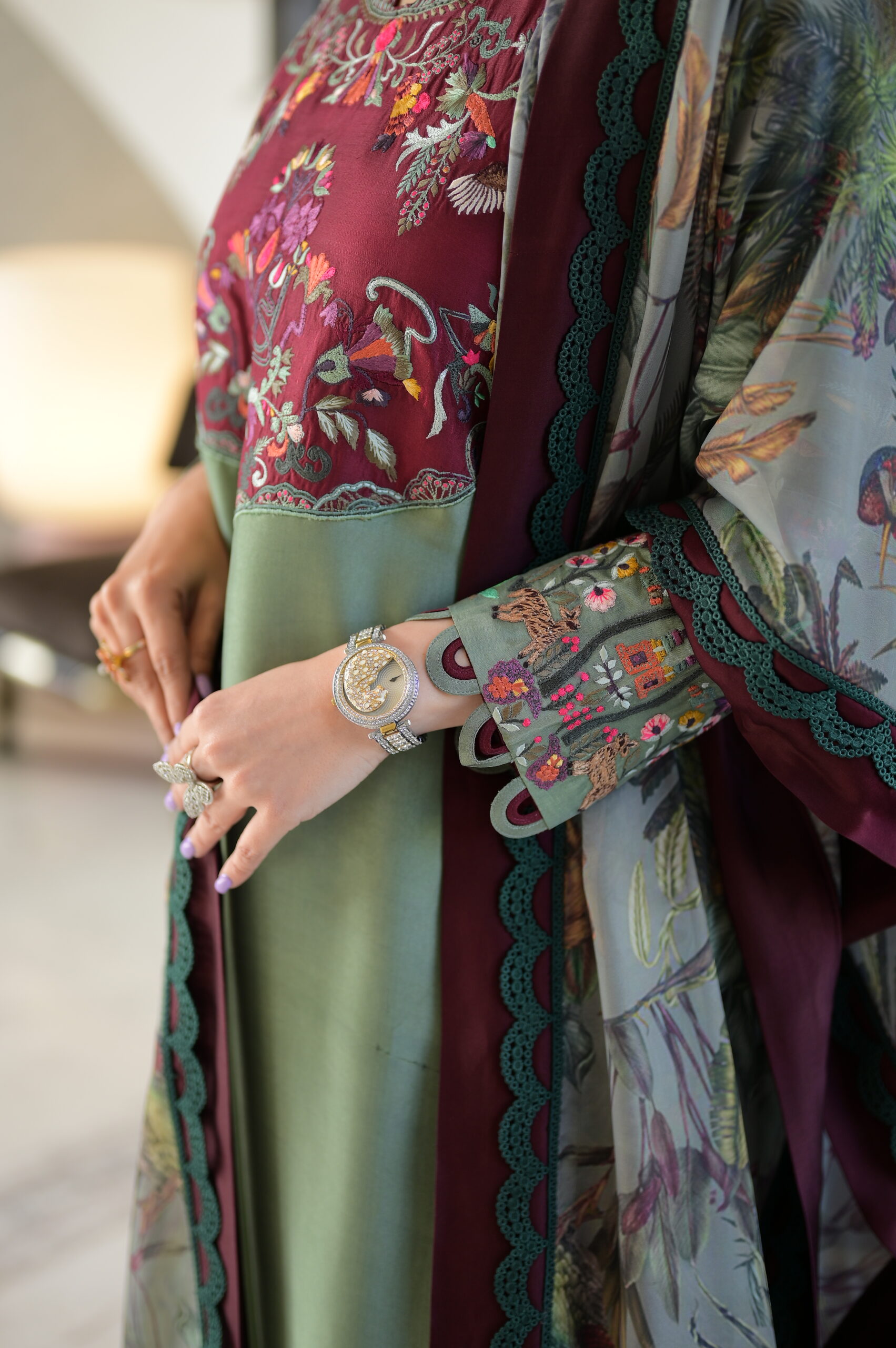 A silk kaftan shirt with detailed embroidery theme comes with beautiful silk printed dupatta .