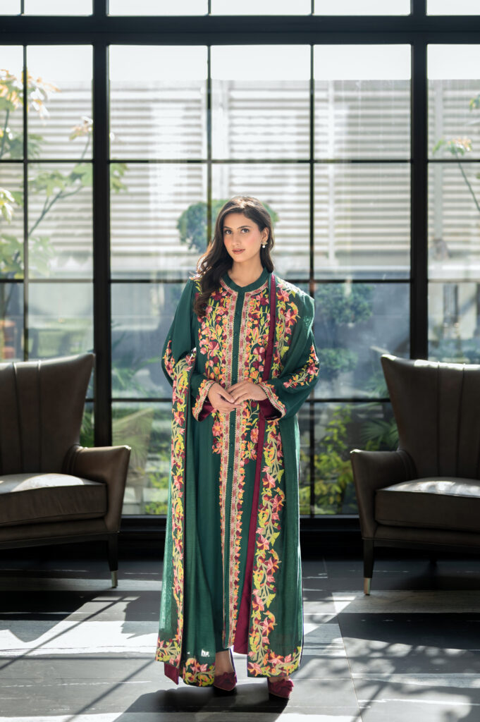 A radiant yellow sheesha silk shirt featuring delicate embroidered birds ,flowers and cutwork details .Finished with hand – embillshed neckline, a printed and embroidered silk dupatta , and beautifully embroidered pants – perfect for an elegant Eid look.